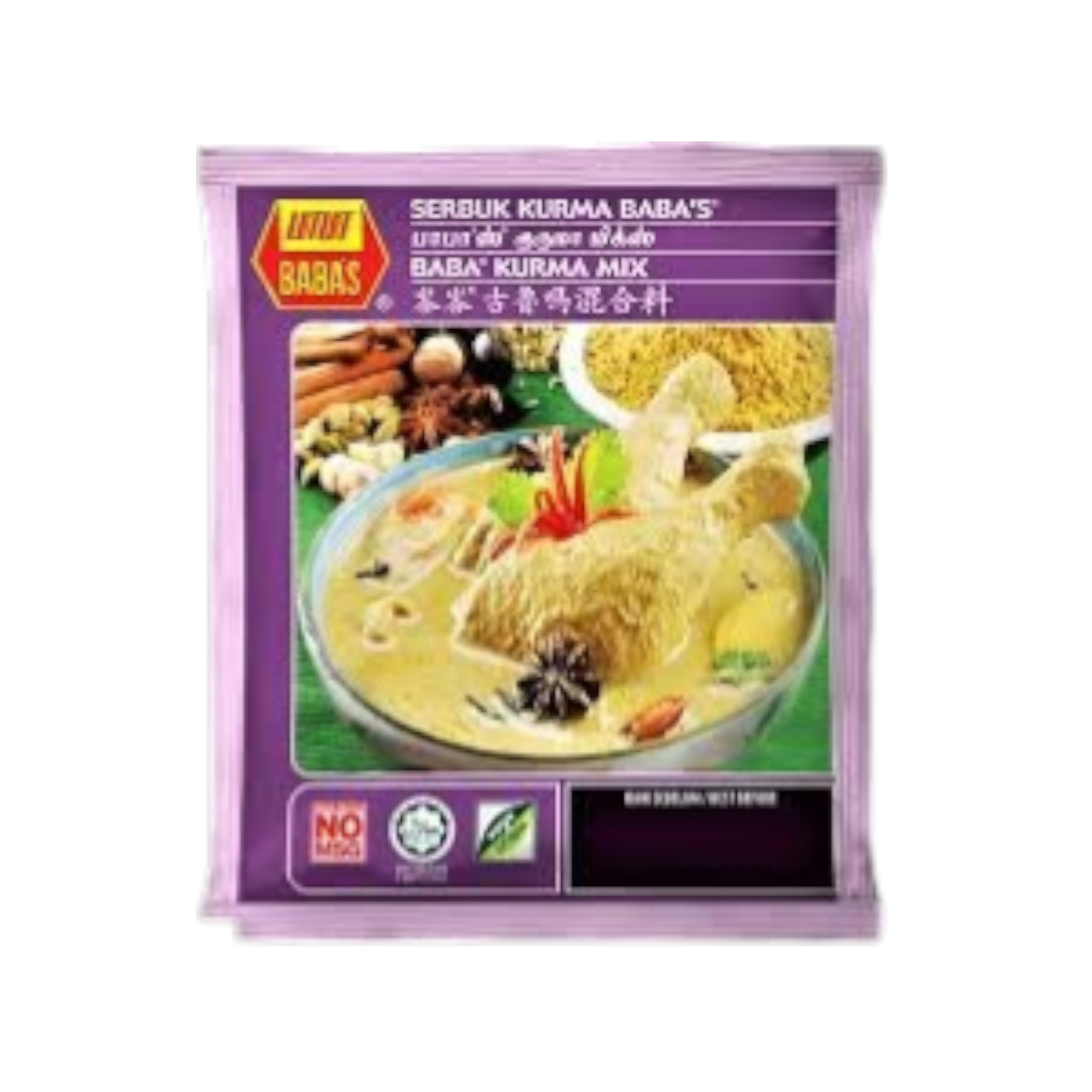 Baba's Kurma Mix 25g is a blend of carefully selected spices used to prepare Kurma, a mild and flavorful Malaysian curry dish. This spice mix is known for its ability to create a rich, creamy curry taste and is often paired with chicken, beef, mutton, or vegetables. It's a traditional, vegetarian recipe, free from MSG, additives, or preservatives