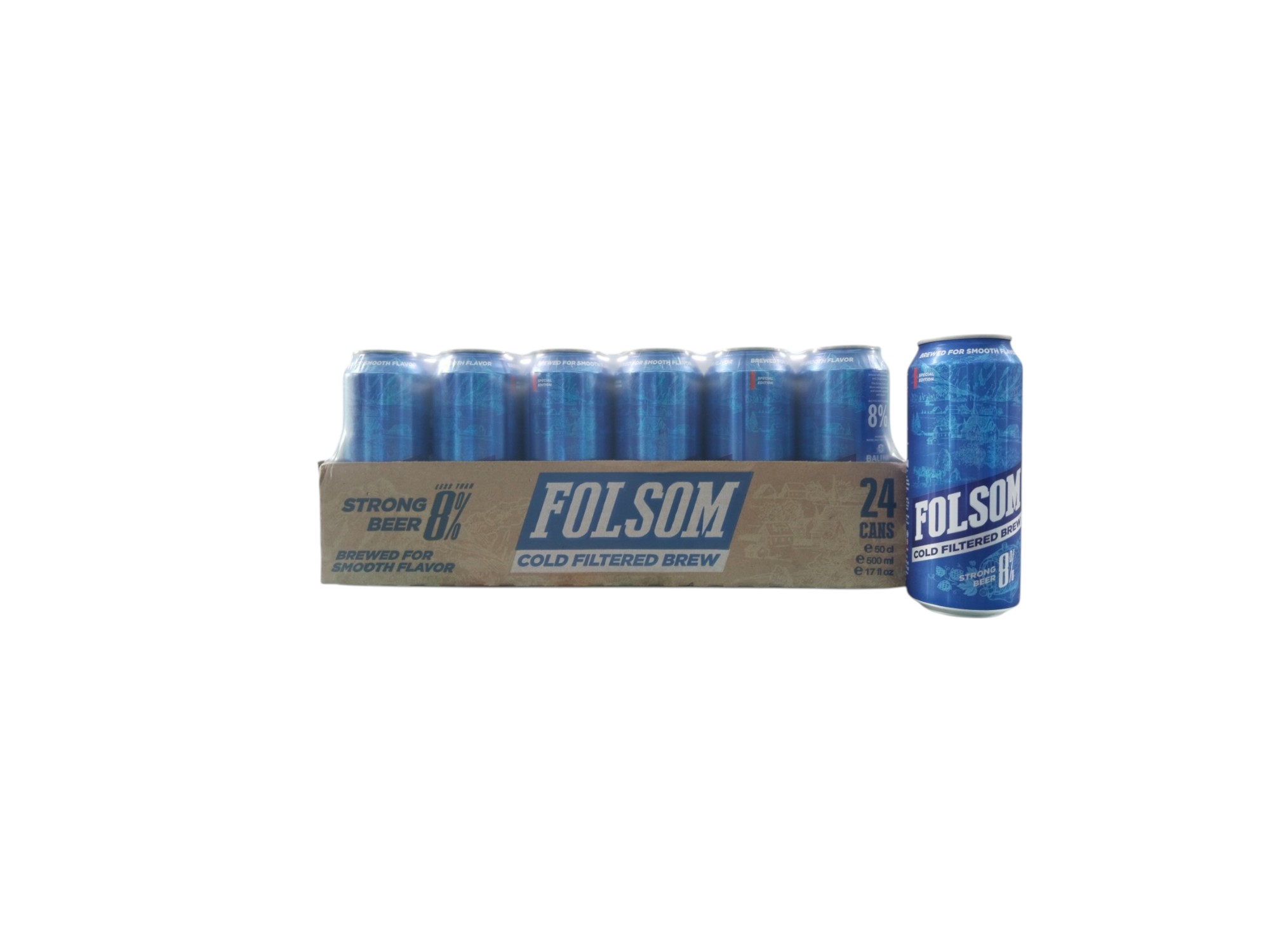 "Folsom Strong Beer 8%", is a strong beer with an 8% ABV (alcohol by volume). The product is available in 500ml cans, and while it's not explicitly detailed in the search results, it's likely to have a malt-forward flavor profile with subtle hop bitterness and aromatics, given its categorization as a strong beer.
