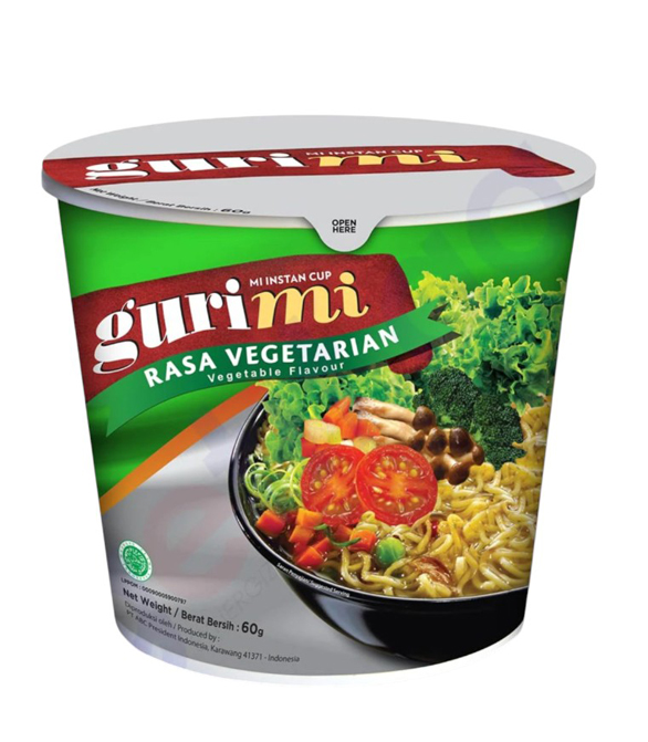 Gurimi Vegetable Flavor 60g is a brand of instant cup noodles with a vegetable flavor. The noodles are made with wheat flour, potato starch, and palm oil. The seasoning includes a vegetable flavor, garlic powder, onion powder, and various spices. It is a quick and easy meal option, requiring only hot water and a few minutes of waiting time.