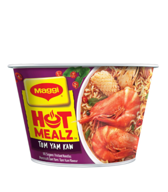 Maggi Hot Mealz Tom Yam Kaw 96g is an instant noodle bowl featuring the spicy and sour flavors of Tom Yam Kaw, a popular Thai soup. It is known for its rich, aromatic broth made with real chilies and fragrant Tom Yam spices, and is ready to eat in minutes. The noodles are thicker and springier, and the dish includes garnishes like leek and chili.