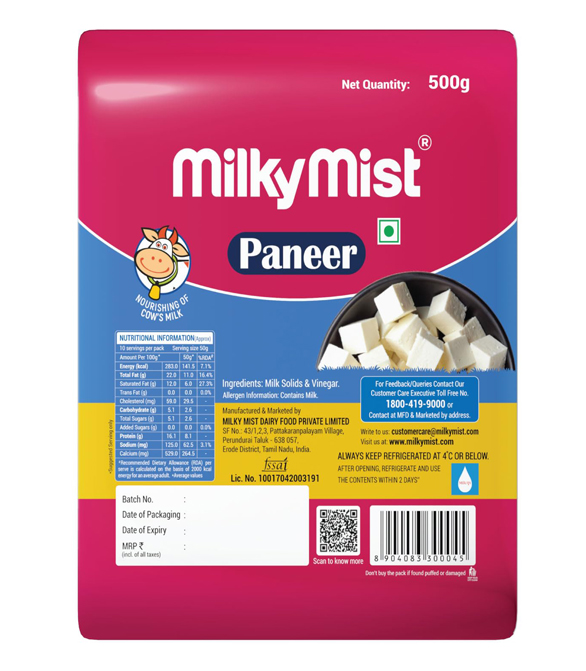 Milky Mist Paneer 500g is a fresh, soft, and creamy cottage cheese, ideal for various Indian dishes and other culinary creations. It's made from pure cow's milk, making it a good source of protein and calcium, and suitable for vegetarians and health-conscious individuals. The 500g pack is a convenient size for households or for those who want to explore different paneer recipes.