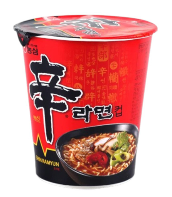 Shin Ramyun 65g, also known as Shin Ramyun Cup, is a popular instant noodle product from Nongshim, known for its spicy and savory Korean-style broth. It features chewy noodles and a rich, spicy soup, offering a quick and convenient meal option. The 65g size is a smaller, single-serving cup.