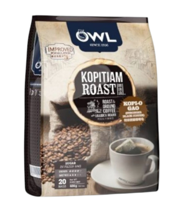 Owl Kopitiam Roast Kopi-O (Pack of 20) is a pack of 20 individual sachets of dark, coarse ground coffee, inspired by traditional Singaporean coffee shop culture. Each sachet is designed for easy brewing, similar to a sock-like filter bag, delivering a rich, aromatic, and strong black coffee, or "Kopi-O". The "Gao" in the name indicates a strong brew, equivalent to an Asian espresso, according to one retailer. The product is Halal-certified.