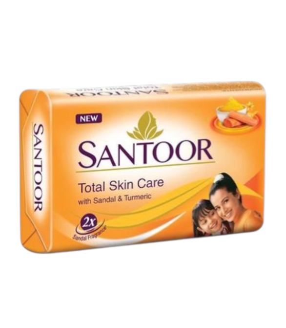 Santoor Total Skin Care 100g soap is a bathing bar that combines the benefits of sandalwood and turmeric for total skin care. It is designed to provide a smooth, soft, and clear complexion while also giving a youthful glow. The soap is known for its deep-acting ingredients that help with issues like blackheads, acne, and skin allergies. It also aims to remove tanning, cure skin itching, and detoxify the skin.